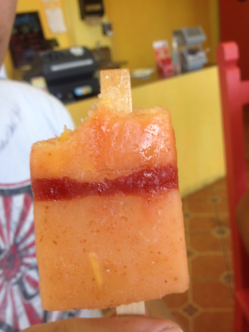 My choice was the refreshing, sweet, tart, and overall most delicious thing ever, the Jamaica (not like "yeah,mon we be jammin', but like ham-ike-a). If you have ever been to a taco shop and seen the trio of mexican juices, the purple-ish one is Jamaica. This was no joke the best Popsicle I have ever had. It was the perfect sweetness and wasn't overly water when eating it. It was super refreshing and put a cease and desist order on the lava flowing through my veins.